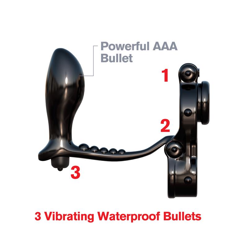 Push your package out to its maximum potential and enjoy a super tight tug on your balls while the vibrating prostate plug makes you cum harder than ever before. The ball stretcher pulls down on your testicles and prevents them from retracting upward, delaying ejaculation and prolonging the fun. One bullet sits on the top ring for direct clitoral stimulation, one sits behind your boys for an incredible ball buzz, and one bullet sits inside the prostate plug for wall-banging backdoor bliss.