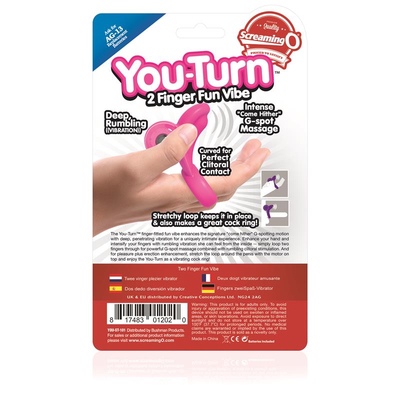 The You-Turn finger-fitted fun vibe enhances your hand and transforms your fingers with a unique design unlike anything on the market. Use the You-Turn to boost the signature ?come hither? G-spot massage motion with penetrating vibration and clitoral stimulation.